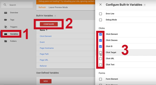 - Under ”Variables” -> ”Konfigurer” skal du nu sikre at der er flueben ved alle 6 type kliks