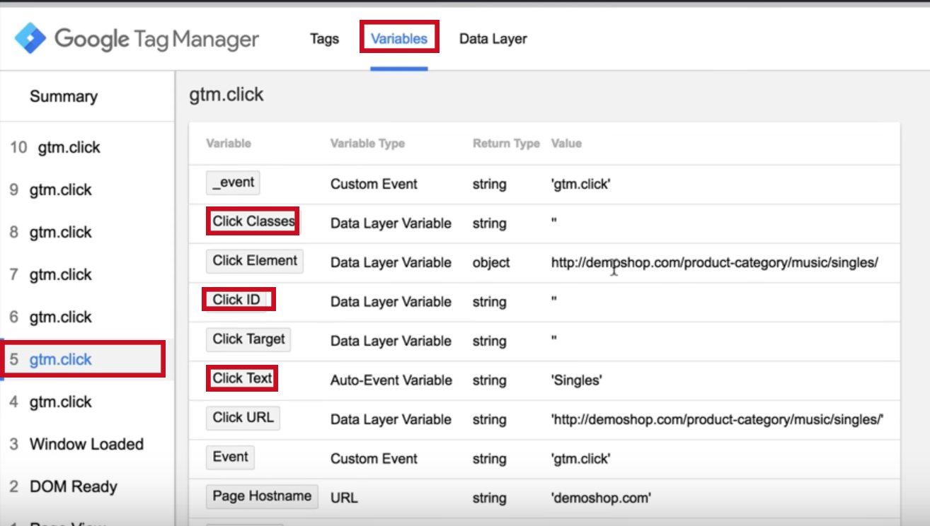 - Udforsk hvilken variable som affyres når du klikke på en bestemt knap (NB! Hold Ctrl ned når du klikker for ikke at åbne ny side i samme fane).