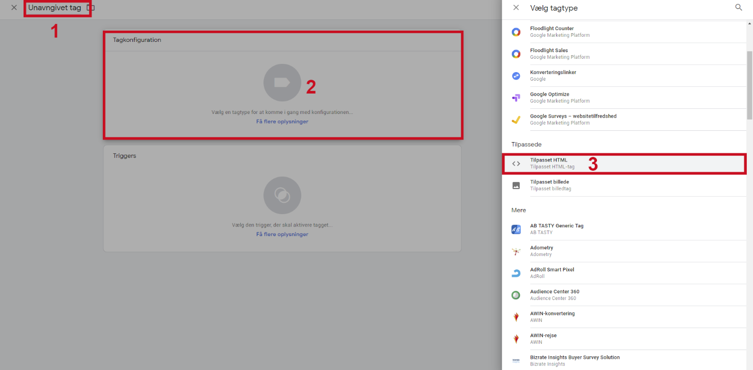 - Navngiv taggen, Klik tagkonfiguration og tilfølj ”Tilpasset HTML”