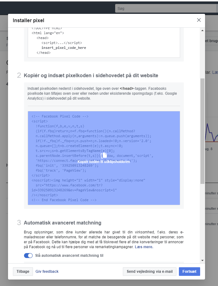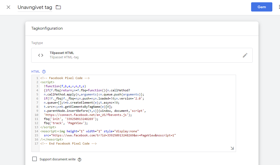 - (luk ikke Facebook-fanen) Gå til bage til Tagmanager på ”indsæt” koden i HTML feltet
