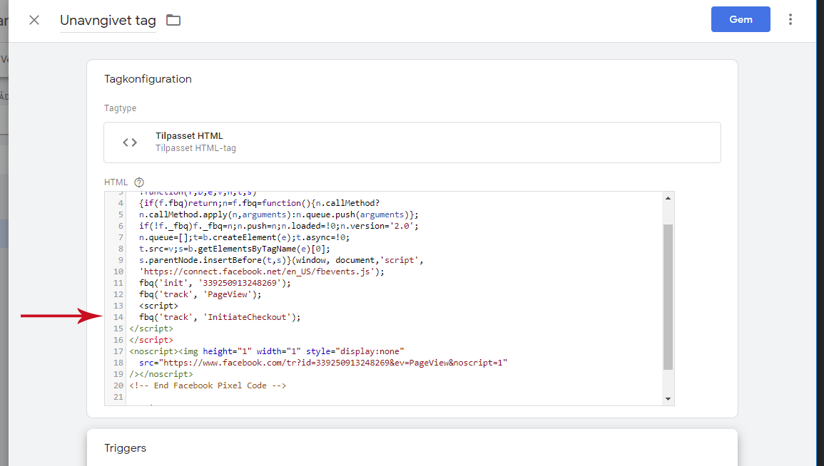 - Klik nu på Trigger (under kodefeltet) og vælg den trigger du oprettede. Klik så ”Gem”